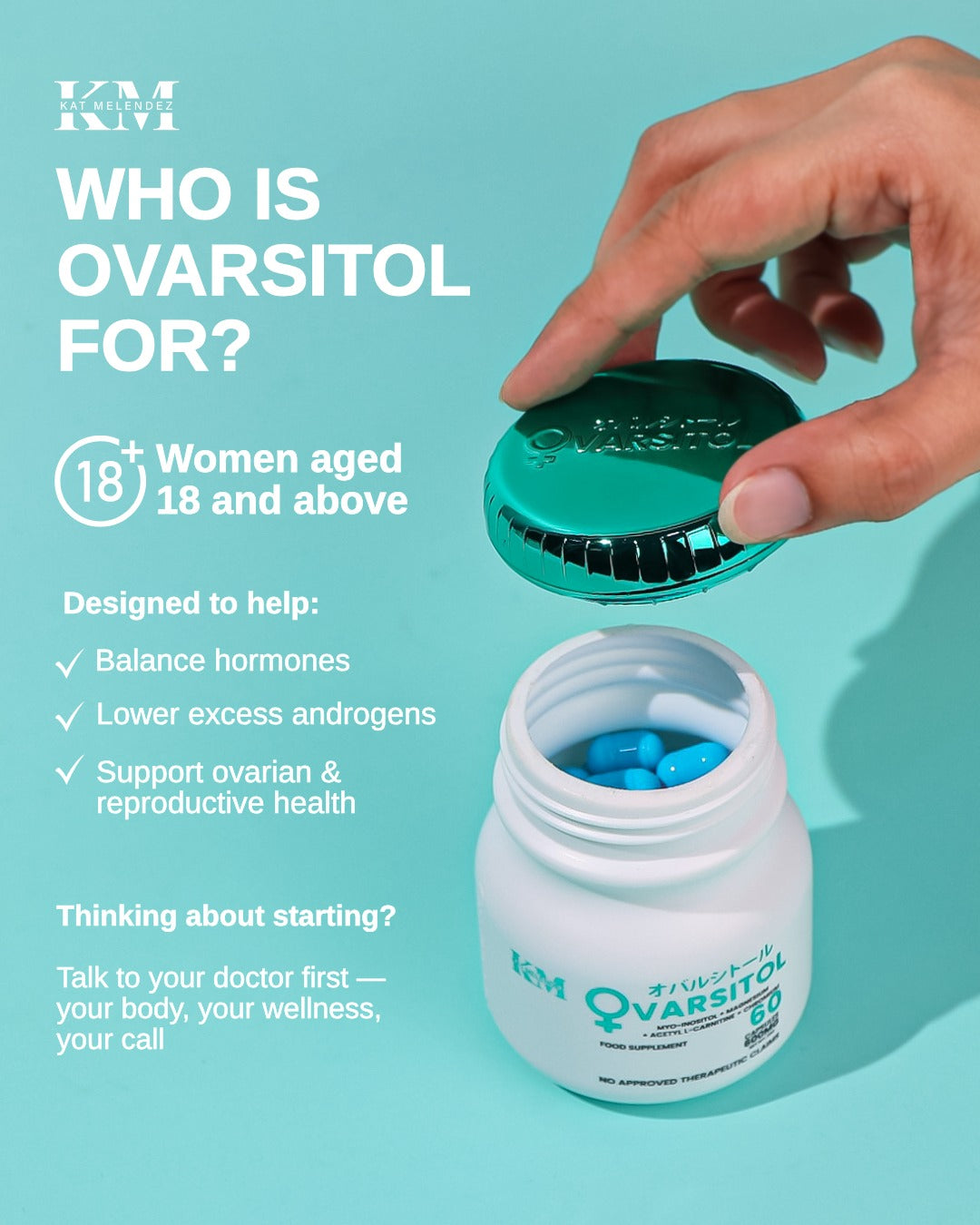 Ovarsitol is a food supplement that supports women's hormonal health. It is recommended for women dealing with Polycystic Ovary Syndrome (PCOS). Women can also take it without PCOS to balance hormones and support overall health. This supplement is designed to aid in various aspects of women's health.